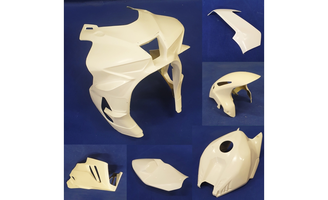 Pack Carénage competition en fibre de verre renforcé carbon/kevlar finition gelcoat blanc ou noir avec préparation peinture et décoration.